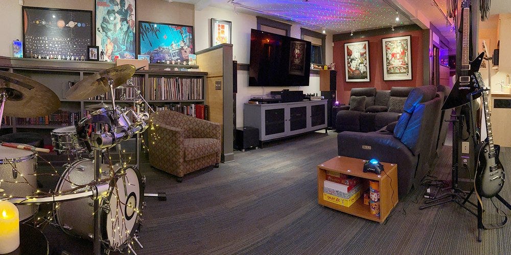 We wrapped up the transformation of Chris’s old office to what has now been officially dubbed the Rec Room. Behind that red wall with the two movie posters is our in-house Kinko’s. There was a second office where the two La-Z-Boys and TV are now; you can see the outline of the old walls on the ceiling. I loved our office and it served us very well for 15+ years, but now that it’s set up as an entertainment, music-making, hang-out space, it’s hard to imagine that it was ever anything else.