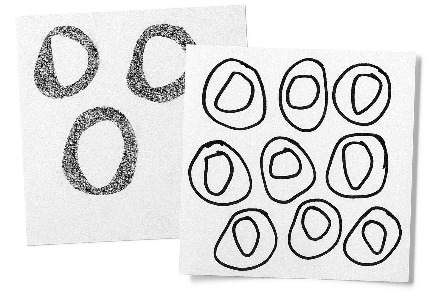Once I have a direction, I start drawing motifs — the individual shapes and marks that will eventually become the pattern. For this batch, I used a chisel-tip Sharpie and Neocolor II crayon on stipple-texture paper.