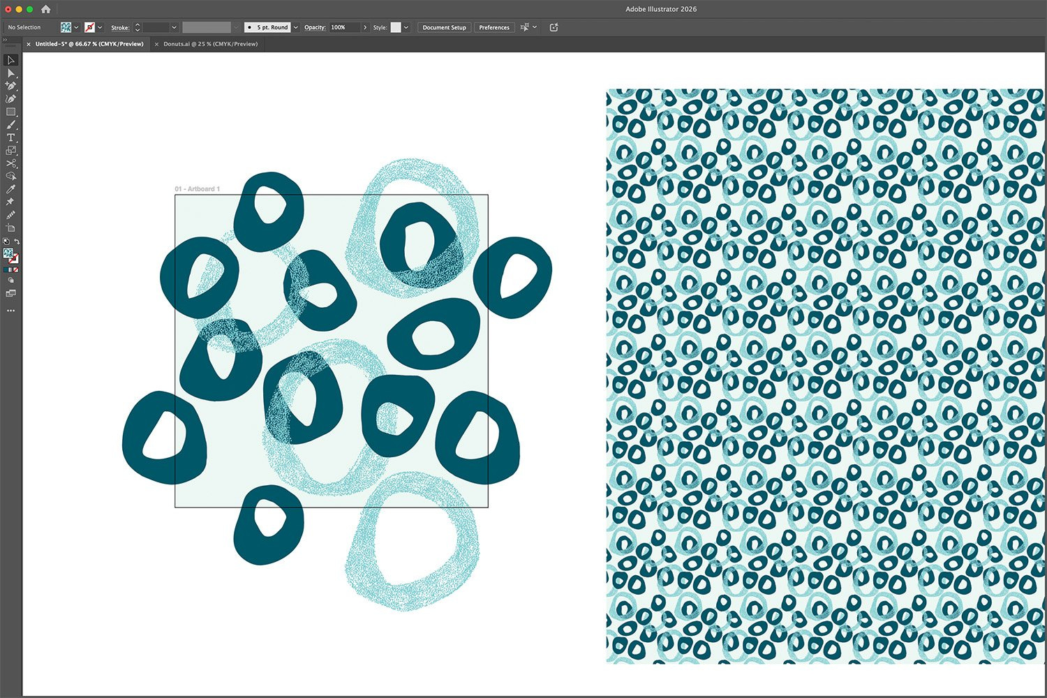 After scanning the artwork, I bring it into Illustrator and use the Image Trace tool to turn the drawings into editable digital shapes. Then I use the Shape Builder and Smooth tools to clean things up and get the motifs ready to use.
